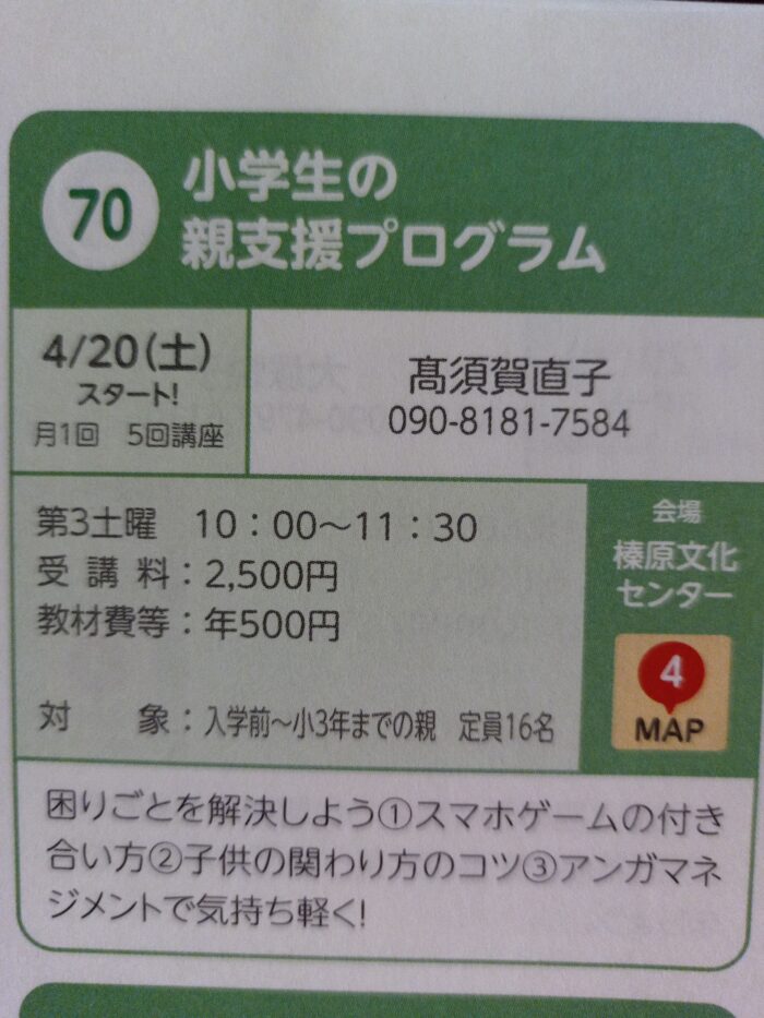 お子さんが小学校に進級する頃は、親も子供本人も変化がたくさんありますね。そんな時この講座がお役に立つかもしれません。ノーバディズパーフェクトを基礎とした講座で、関東圏の市町村ではプロぐラムが浸透してきています。親としてどう子供と接していけばいいかなど、一緒に学び合いませんか?